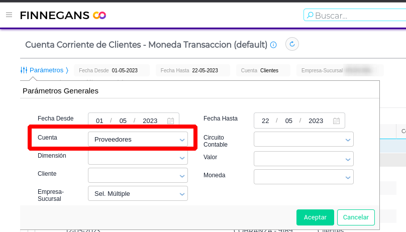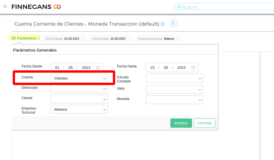 Si sólo se quiere visualizar la información del cliente, en los parámetros en el campo “Cuenta” se le debe indicar la cuenta “Clientes”
