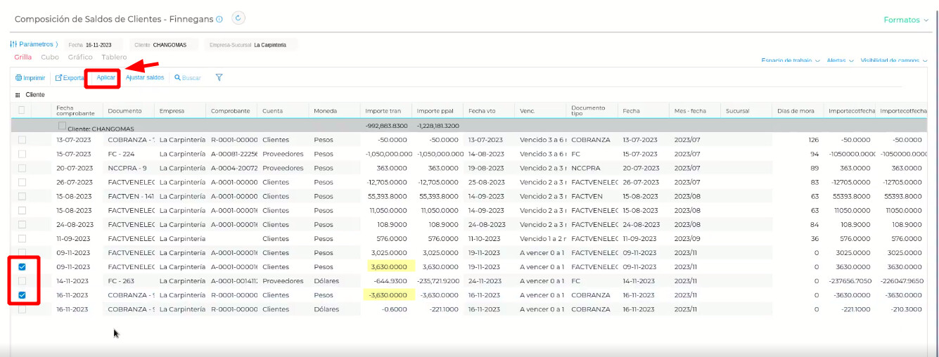 Además, este informe tiene dos funciones adicionales. La primera es que permite aplicar documentos utilizando el botón Aplicar.
