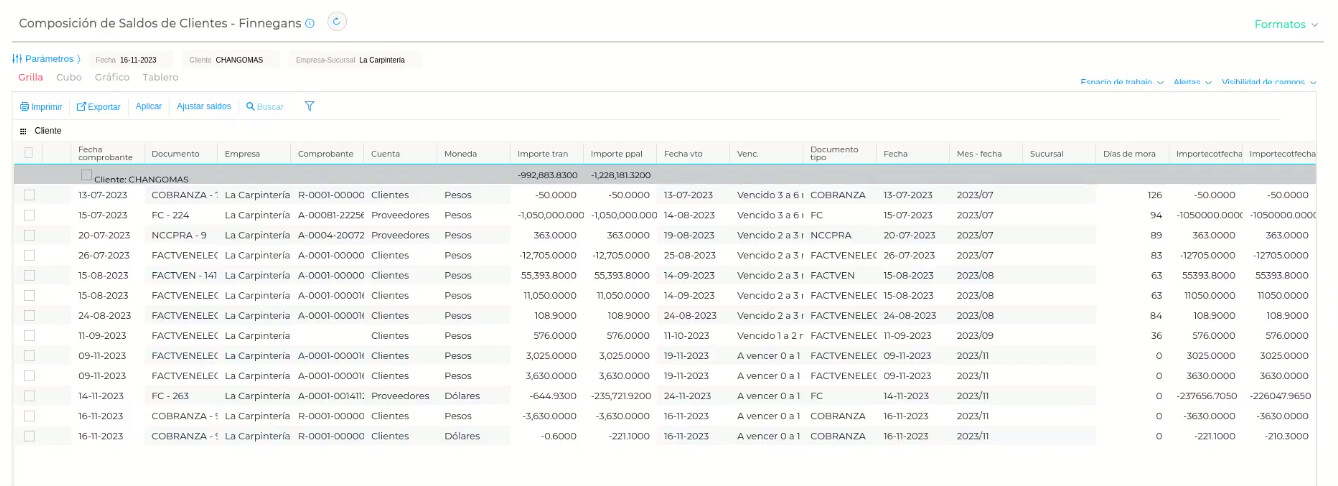 A diferencia del informe de cuenta corriente, donde se presentan todas las operaciones de un cliente, en el informe de Composición de Saldos sólo se muestran los documentos que aún no se han cancelado.