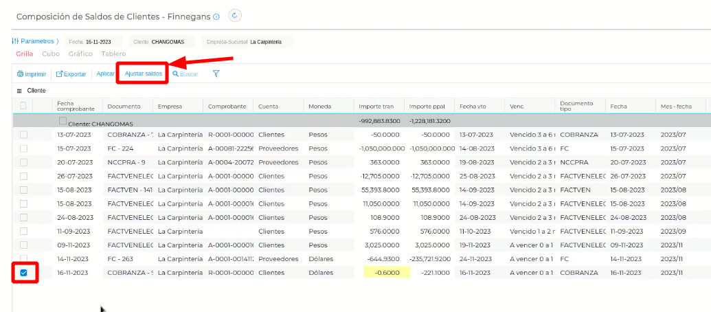 Por ejemplo, tenemos una cobranza por un importe de menos 0,60 dólares. Lo seleccionamos y hacemos clic en ajustar saldos.