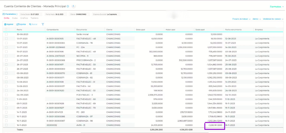 En este informe, según el período seleccionado, es posible visualizar el saldo final del cliente en la columna Saldo principal, que en este caso es de 1.228.181,32.
