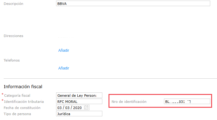 El proveedor indicado como organización asociada en el banco (paso anterior), debe tener completo el campo Nro de identificación (RFC).