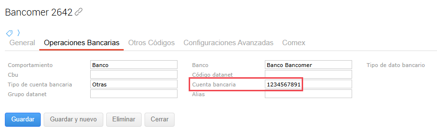 Cuenta, Número, Banco y fecha de vencimiento, además de la operación bancaria, importe y moneda.