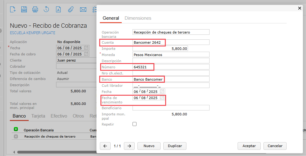 En la cuenta del banco en la que se recibe el cheque (la cuenta usada en el recibo de cobranza), se debe completar el campo cuenta bancaria