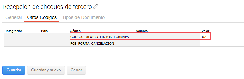 En el tipo de operacion bancaria, Recepcion de cheques de tercero, se debe configurar el código adicional CODIGO_MEXICO_FINKOK_FORMAPAGO con el valor 02