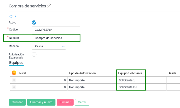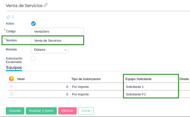 Ir a Menú > Configuración > Diseño del espacio de trabajo > Documentos > Equipos Solicitantes y Autorizantes