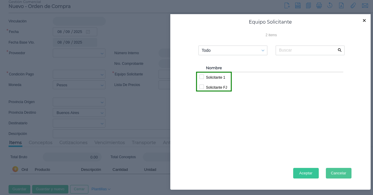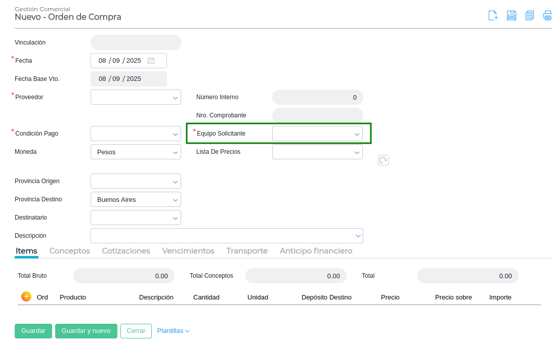 Ahora, al generar una nueva operación de Orden de Compra, se visualiza que el campo “Equipo Solicitante” viene vacío y al hacer clic sobre el selector muestra todos los Equipos a los que pertenece el usuario. Para esto ir a Menú > Gestión Empresarial > Compras > Transacciones > Órdenes de Compras: