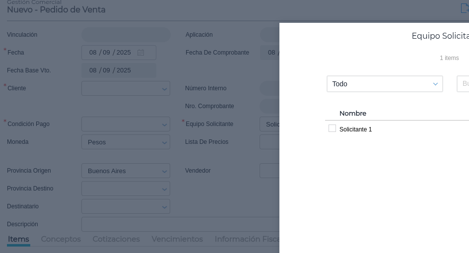 Ahora, al generar una nueva operación de Pedido de Venta, se visualiza que el campo “Equipo Solicitante” se autocompleta con el Equipo al que pertenece el usuario. Para esto ir a Menú > Gestión Empresarial > Ventas > Transacciones > Pedidos: