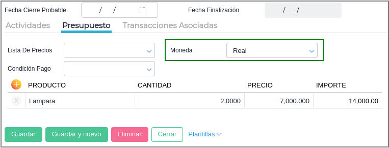 Abrir una nueva Oportunidad que tenga seleccionada un tipo de moneda en la solapa presupuesto: