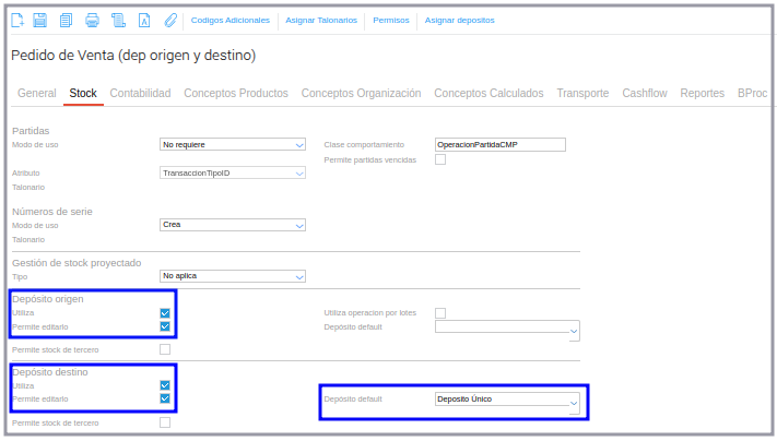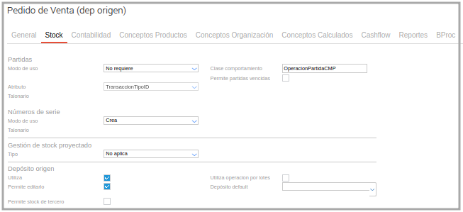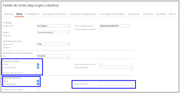 Ir Menú ─> Configuración ─> Diseño de espacio de trabajo ─> Tipo documento. En el tipo de documento Pedido de Venta se define que se utiliza depósito de origen y se utiliza con depósito destino