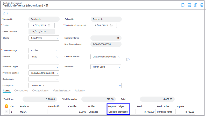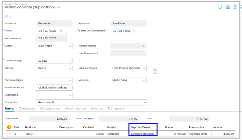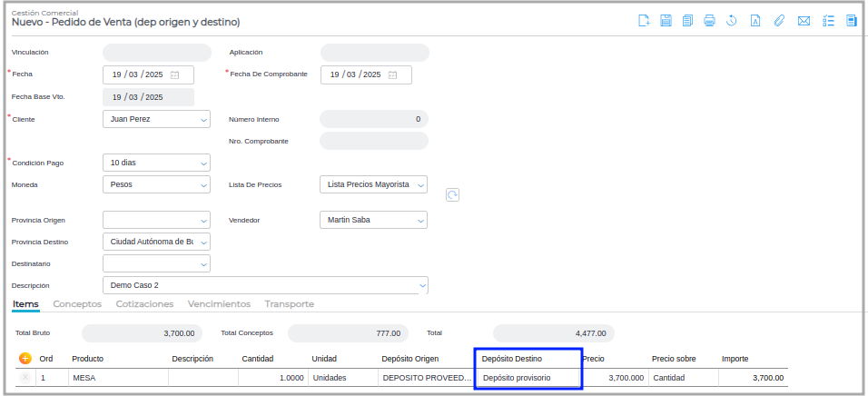 Paso 1 - Ir a Gestión Empresarial ─> Ventas ─> Pedido de Venta, crear un pedido seleccionando, un depósito de destino, como se ve en la siguiente Imagen, cuyo depósito es “Depósito Provisorio”.
