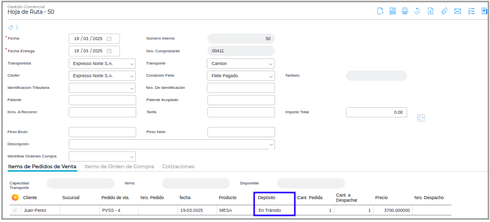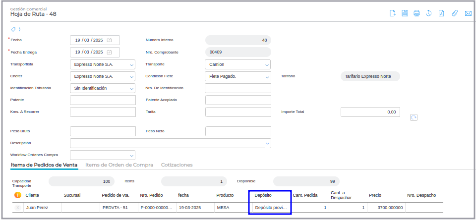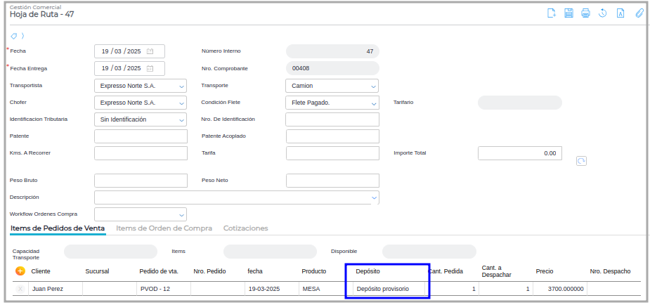 Paso 2 - Ir a Gestión Empresarial ─> Ventas ─> Hoja de Ruta, Crea una Hoja de ruta e incorporar el pedido de venta generado en el punto 1, se verifica que el depósito que figura en la Hoja es el depósito de destino definido en el pedido (Depósito Provisorio)