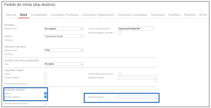 Ir Menú ─> Configuración ─> Diseño de espacio de trabajo ─> Tipo documento. En el tipo de documento Pedido de Venta se define que se utiliza con depósito destino.