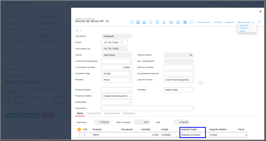 Paso 3 - Generar el despacho desde la Hoja de ruta, se puede corroborar que como resultado el depósito de origen del Remito es el mismo depósito de destino seleccionado en el pedido de venta, siendo este el “Depósito Provisorio”
