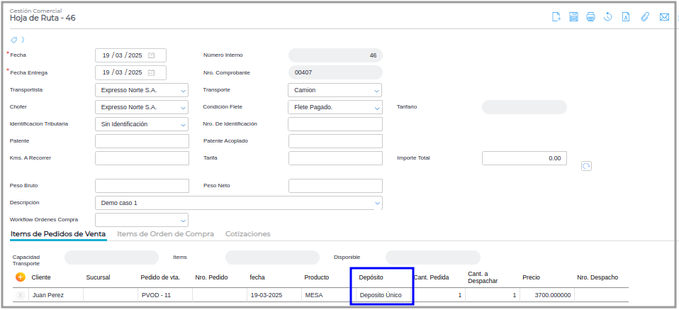 Paso 3 - Generar el despacho desde la Hoja de ruta, se puede corroborar que como resultado el depósito de origen del Remito es el mismo depósito de destino seleccionado en el pedido de venta, siendo este el “Depósito único”