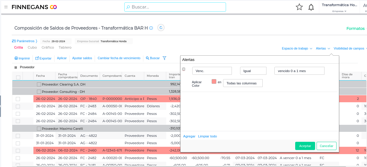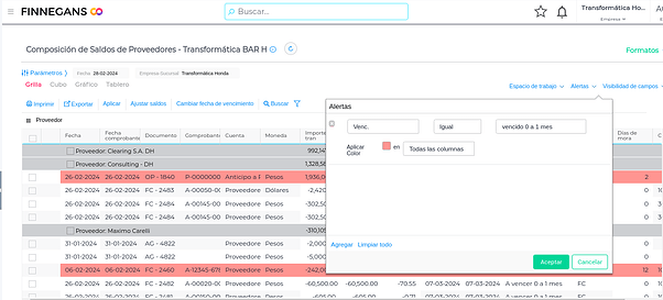 Permite indicar con colores de acuerdo a los criterios seleccionados. Se pueden “Agregar” y combinar más de un criterio. Por ejemplo: si se desea alertar sobre comprobantes vencidos entre 0 y 1 mes, se elegirá el siguiente criterio indicando con el color rosa.