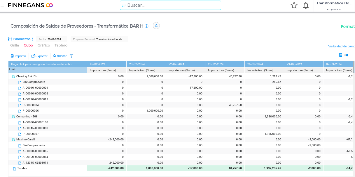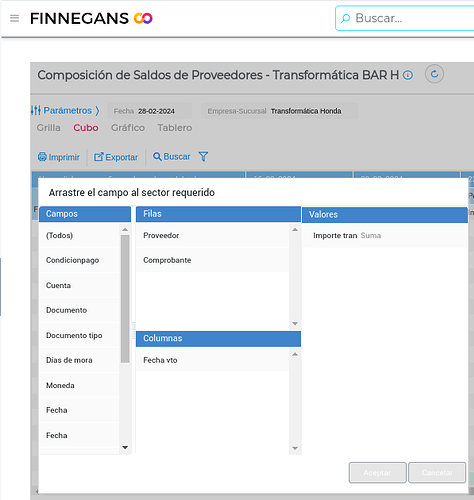 La visualización del informe, con el formato seleccionado, se podrá consultar mediante un cubo (tabla dinámica) que se podrá configurar moviendo los campos a filas o columnas.