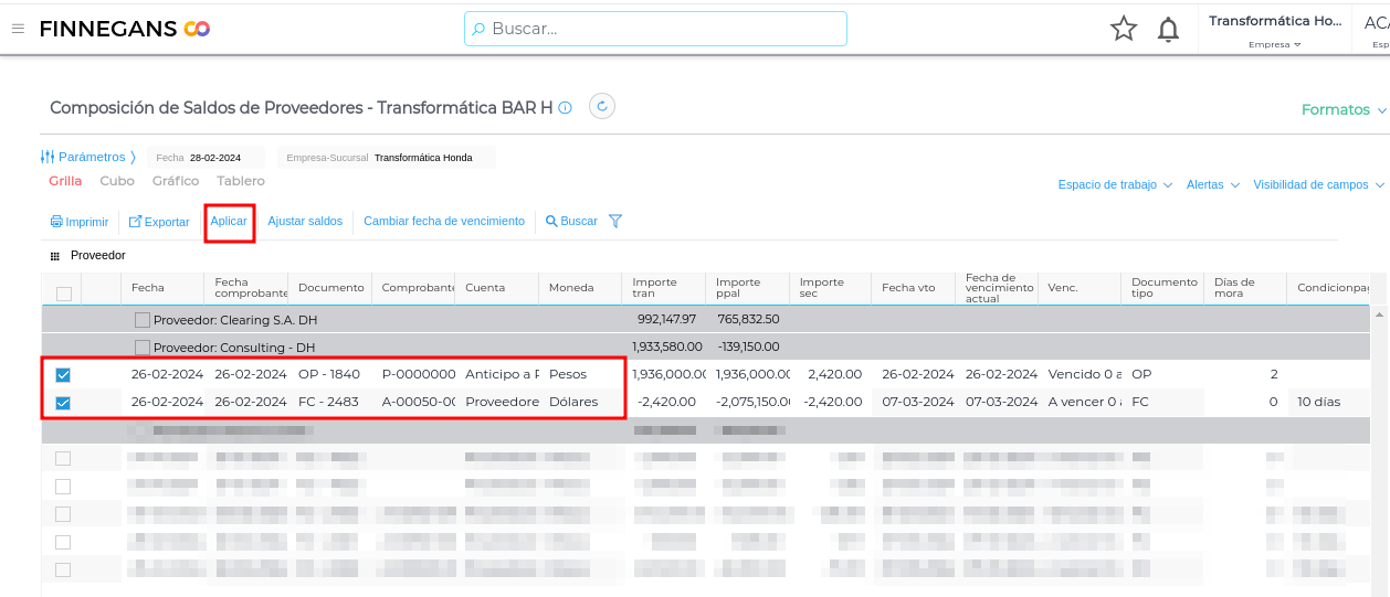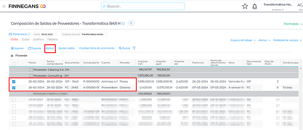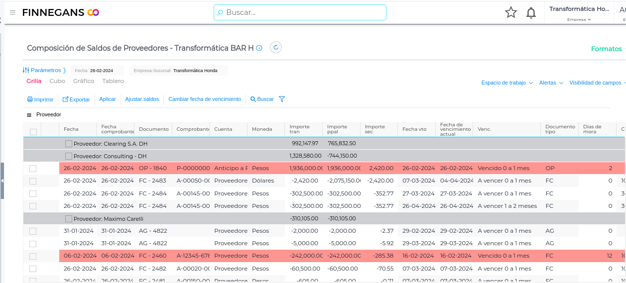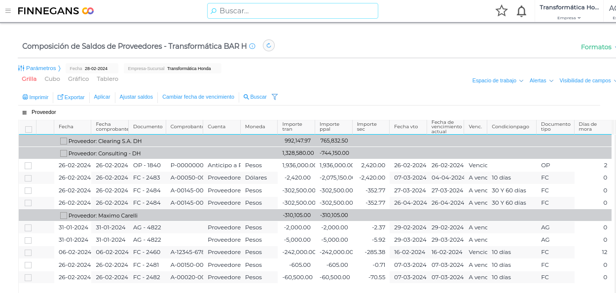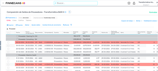 El informe hará una apertura de cada comprobante de acuerdo a la condición de pago que tenga definida, por lo tanto, si la condición de pago es a 30 y 60 días, expondrá el importe proporcional para cada vencimiento (Ejemplo Documento FC-2484)