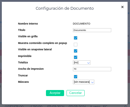 La impresión solo toma en cuenta los campos que en la configuración (*) del campo poseen el tilde de Imprimible y su ancho correspondiente.