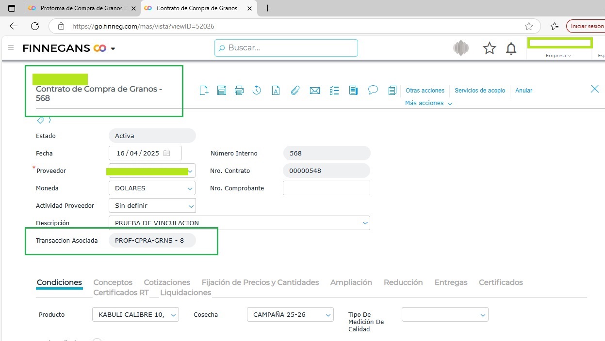 Asociación de la Proforma: Cuando creas una proforma de compra de granos, ésta no se vincula directamente en la solapa de “Vinculaciones” del contrato. En cambio, la proforma queda asociada al contrato en una sección llamada “Transacción Asociada”.