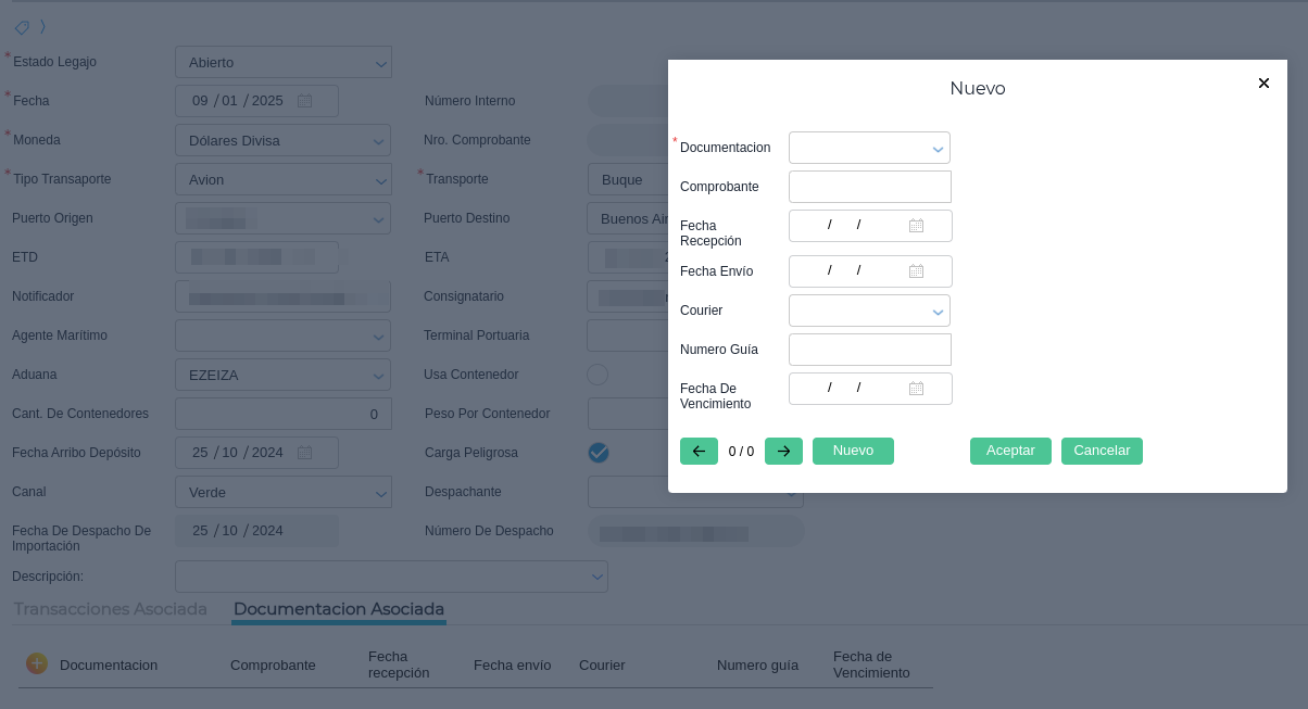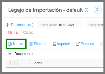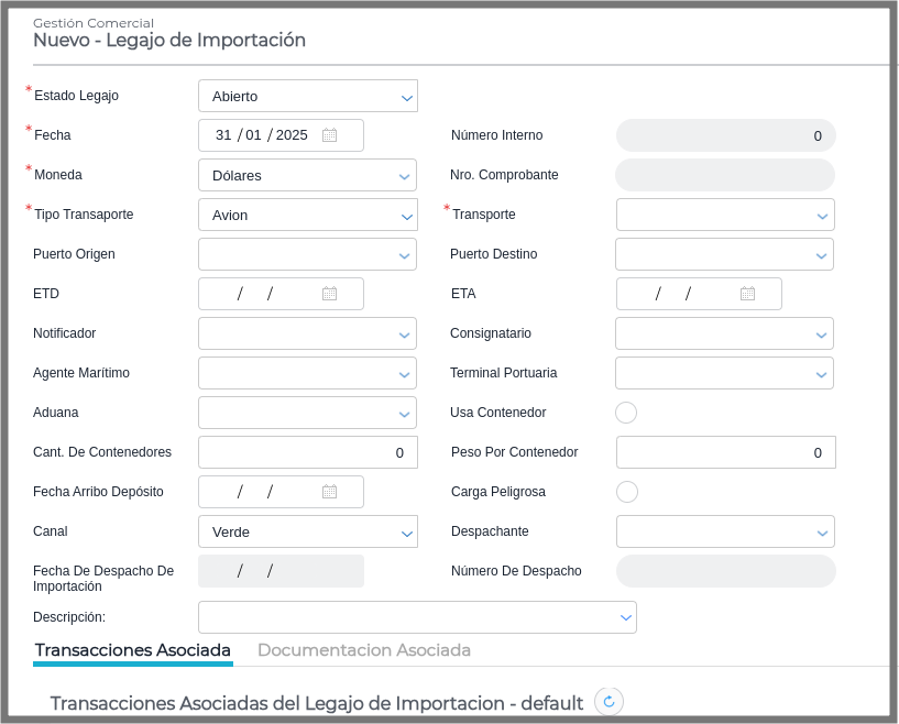 El primer paso es crear el Legajo de Importación, al cual se asociarán posteriormente todas las transacciones.