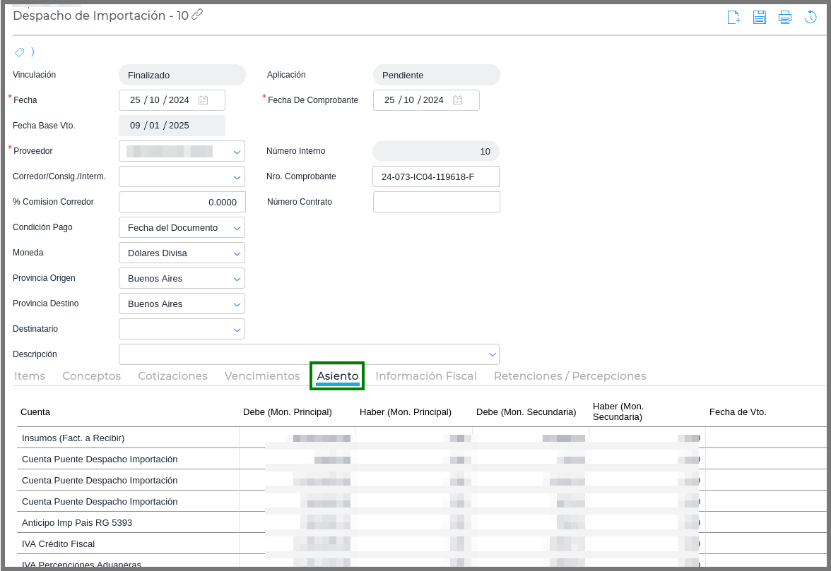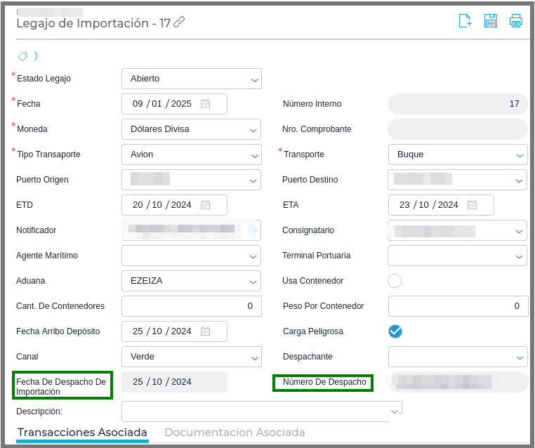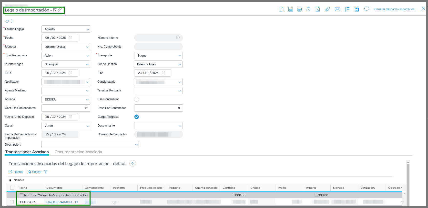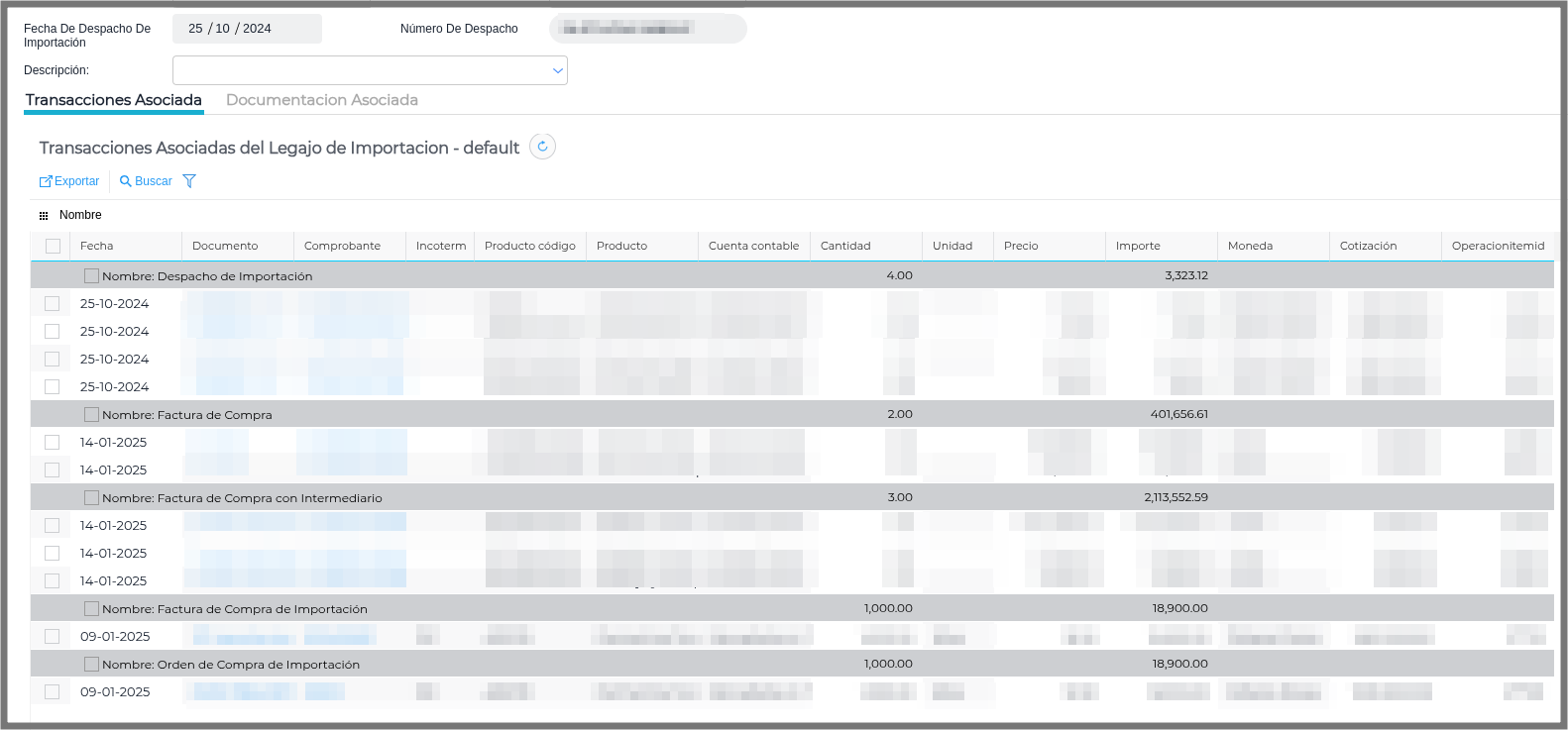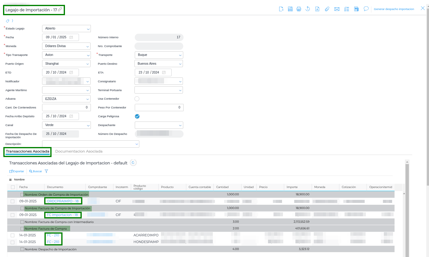 Todos estos comprobantes deben contener el dato del Legajo de Importación. En cada uno de sus ítems. Así, todos los comprobantes imputados al Legajo de Importación, se ven en la solapa Transacciones Asociadas.