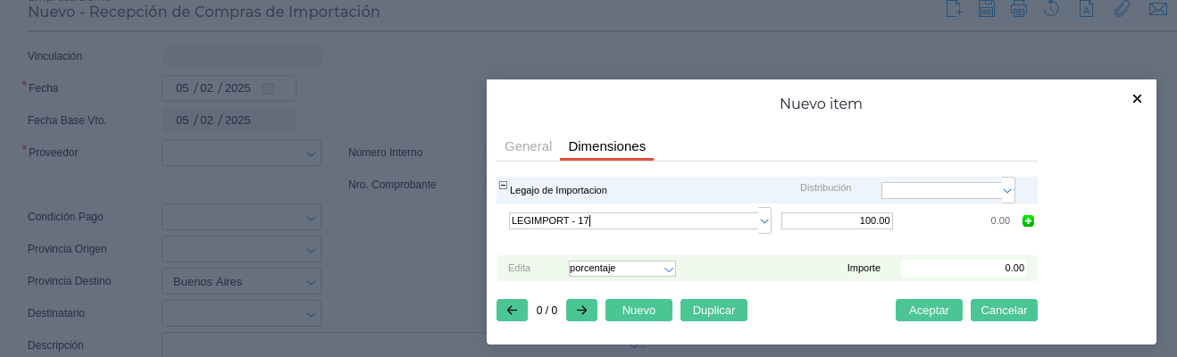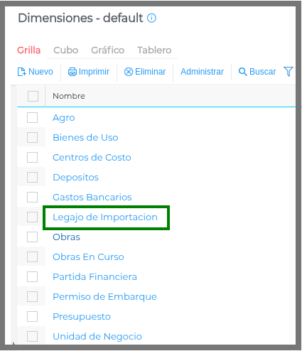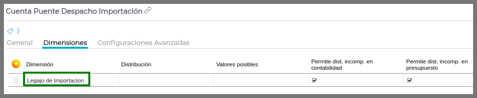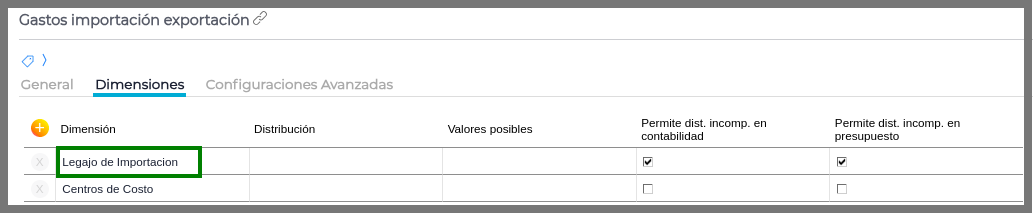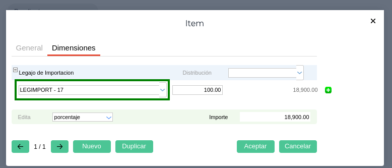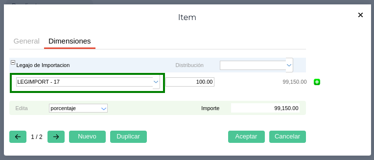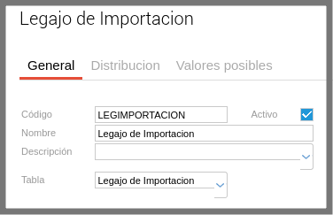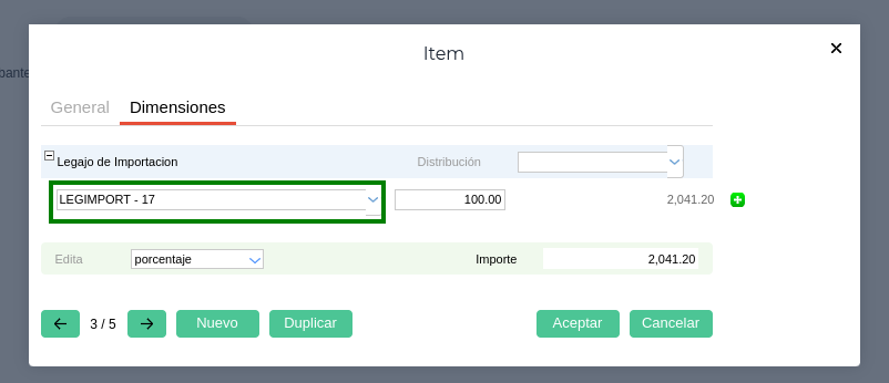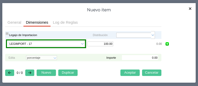 Al crear los legajos de importación, estos se comportan como Dimensión Valor, pudiendo seleccionarlos como Distribución para la Dimensión Legajo de Importación. (Se mostrará en detalle más adelante).