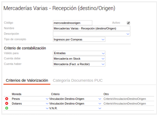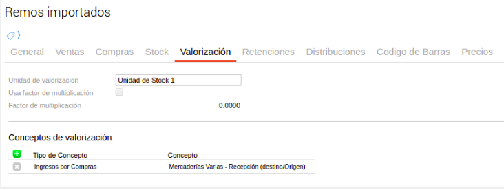 Para valorizar estos productos, y como en el circuito de importación la Recepción se efectúa luego de la Factura, se debe configurar un concepto de valorización en el producto que sea Destino-Origen.