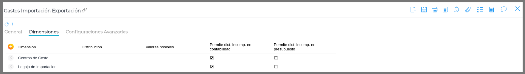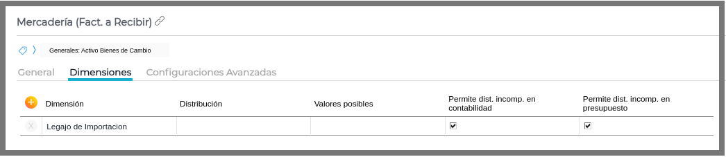 Las cuentas de gastos en las que impactan los distintos productos que reflejan los gastos, también deberán estar configuradas para que impacten en la dimensión Legajo de Importación.