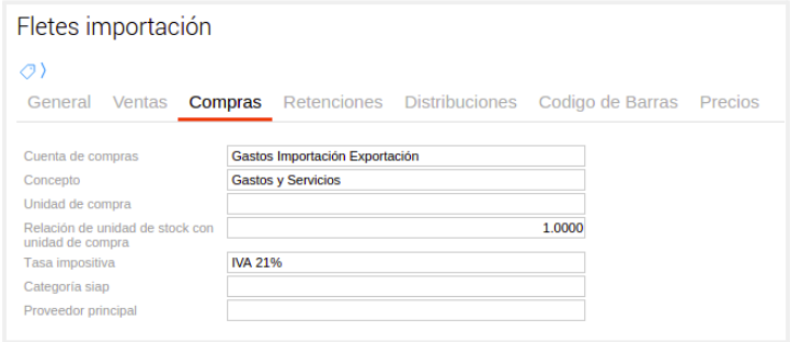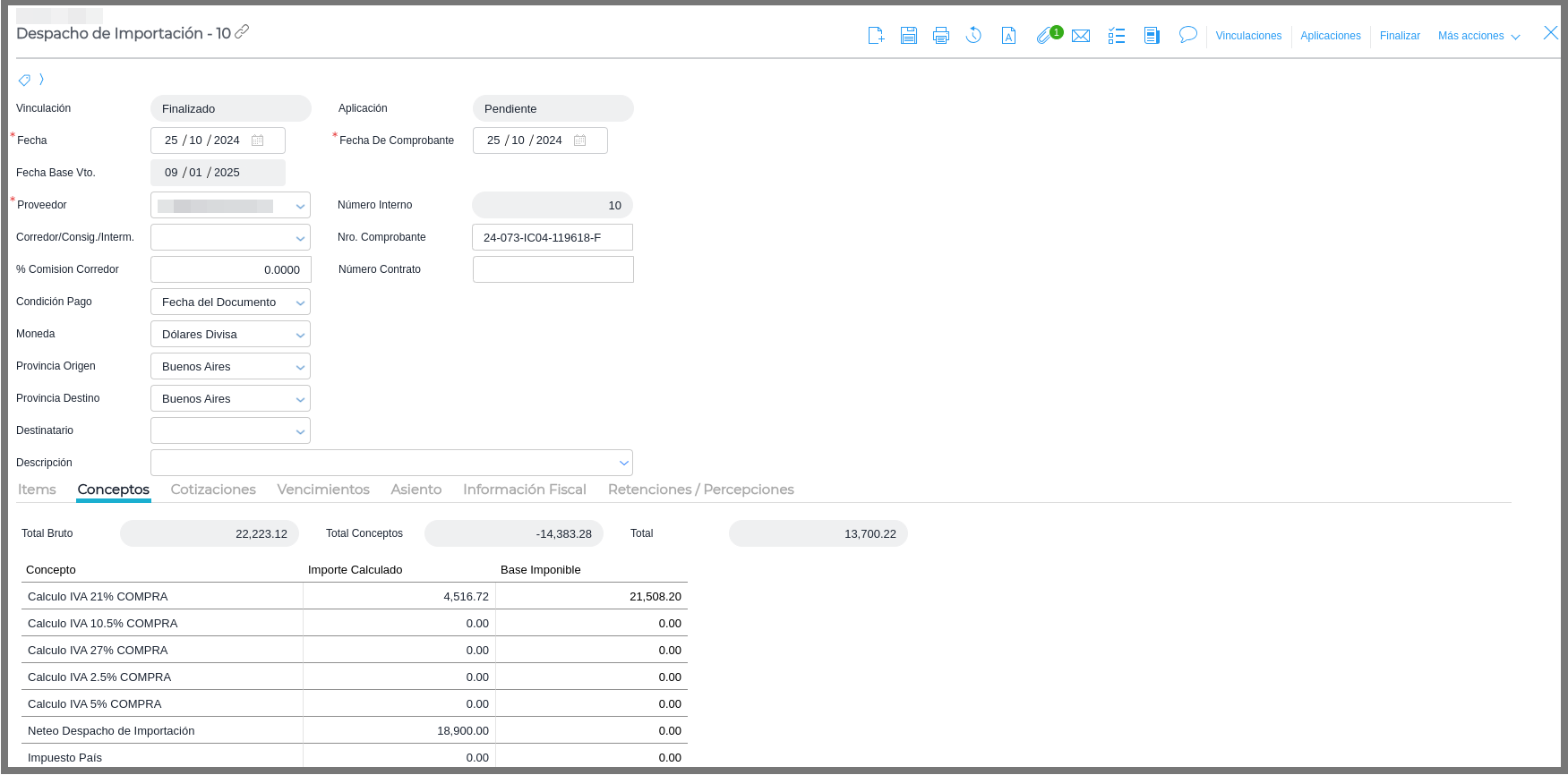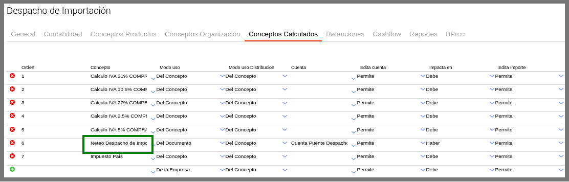 A efectos de exponer correctamente en el Libro de IVA Compras, la RG 3685 y el IVA Crédito Fiscal, en la solapa Conceptos se restará el imponible de los ítems importados que ya fueron facturados. Se sumará el IVA de estos productos, más el IVA de los gastos. Para esto, debe crearse un Concepto Calculado e incluirse en el documento. (Se muestra en configuraciones más adelante).
