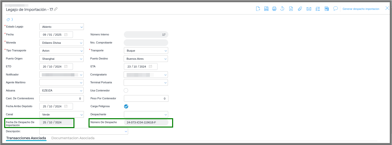 Esto es importante ya que cuando se genere el Despacho de Importación desde el Legajo, en el Legajo se mostrarán la Fecha de Despacho de Importación y el Número de Despacho.