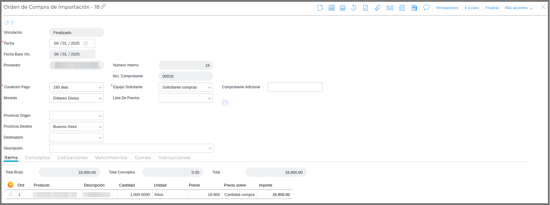 De este modo, la Orden de Compra queda vinculada al Legajo de Importación.