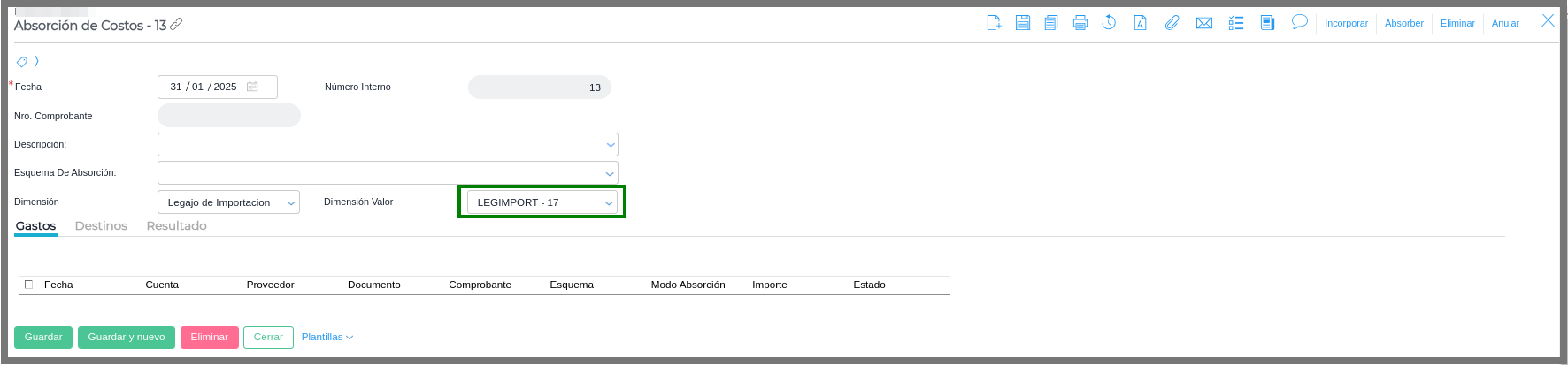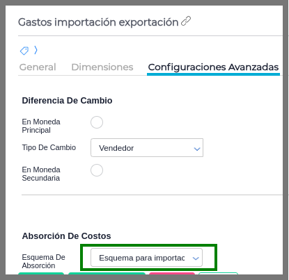 Se selecciona el esquema de absorción, la dimensión Legajo de Importación y en Dimensión Valor, el legajo.