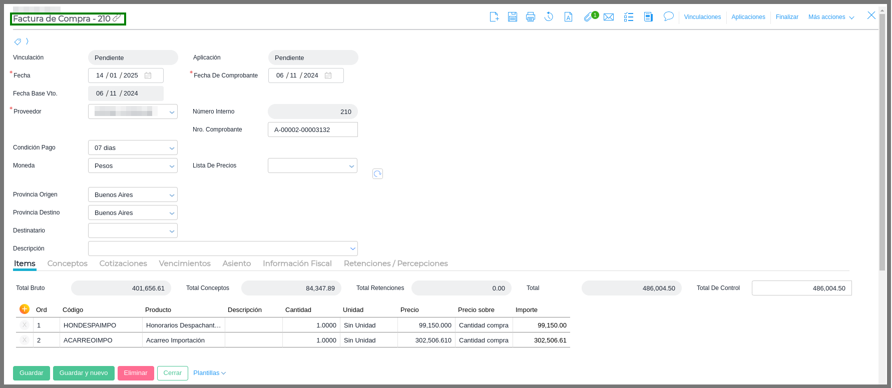 Luego, se cargan las facturas de los proveedores del exterior y los comprobantes de gastos del despachante de aduana y otros relacionados.