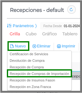 Se accede desde Menú → Gestión Empresarial → Compras → Transacciones → Recepciones.