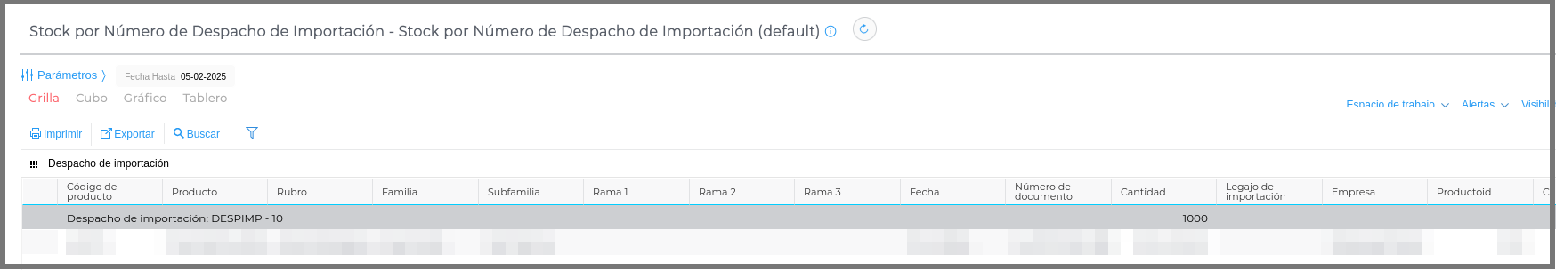 Se accede desde Menú → Gestión Empresarial → Invetarios → Informes → Stock por Número de Despacho de Importación