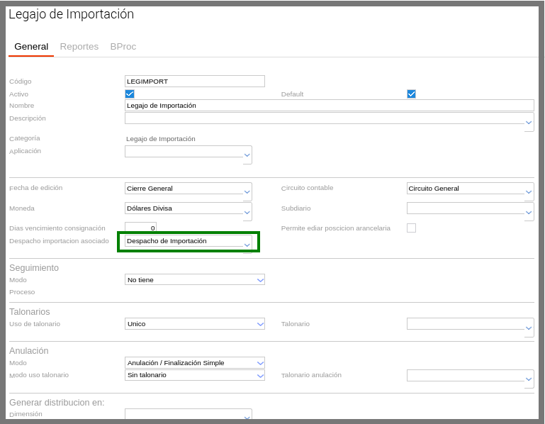 La Fecha de Despacho de Importación y el Número de Despacho, se verán en los datos de cabecera del Legajo de Importación. Para esto, debe configurarse el documento como se indica en configuraciones.