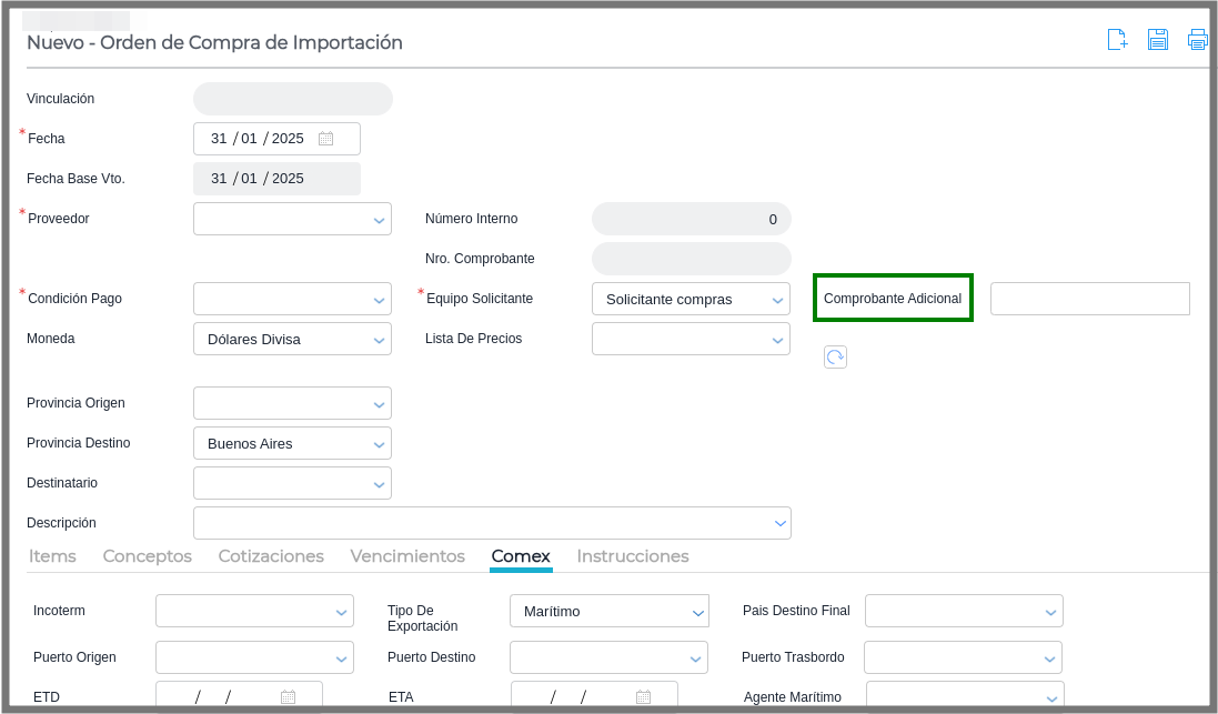 Se configura de forma similar a las órdenes de compra comunes. Se indica que utiliza Comprobante Adicional y que impacta en exportación para poder incorporar un Incoterm.