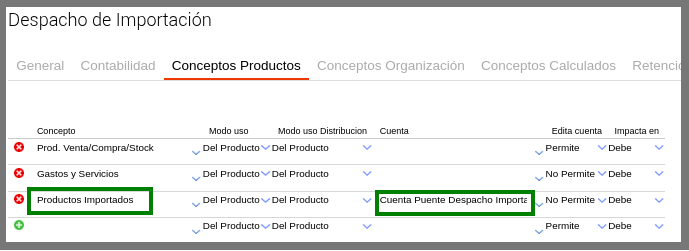 Configurar la cuenta Puente Despacho en el ítem de Concepto de Productos importados.