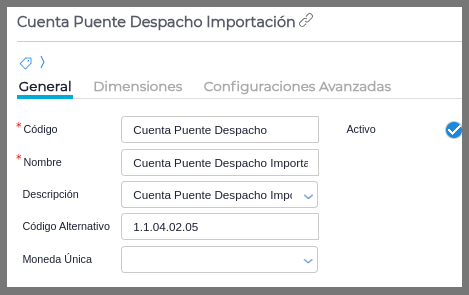 Crear la cuenta puente que utilizará luego el documento Despacho de Importación, concepto calculado “Neteo Despacho de Importación”