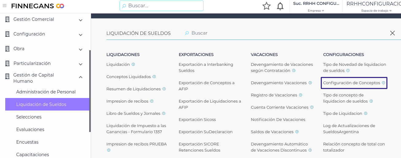 1.- Ingresar a Gestión de Capital Humano - Liquidación de Sueldos - Configuraciones - Configuración de Conceptos