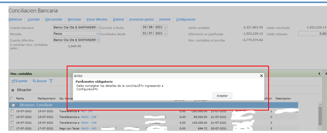 Mensaje de advertencia “Debe completar los detalles de la conciliación ingresando a configuración” a la hora de hacer click en el botón “Conciliar” en el proceso de conciliación bancaria.