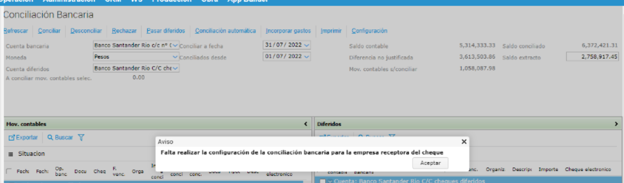 A la hora de conciliar un cheque en la “Conciliación bancaria” el sistema arroja el siguiente mensaje: “Falta realizar la configuración de la conciliación para la empresa receptora del cheque”.