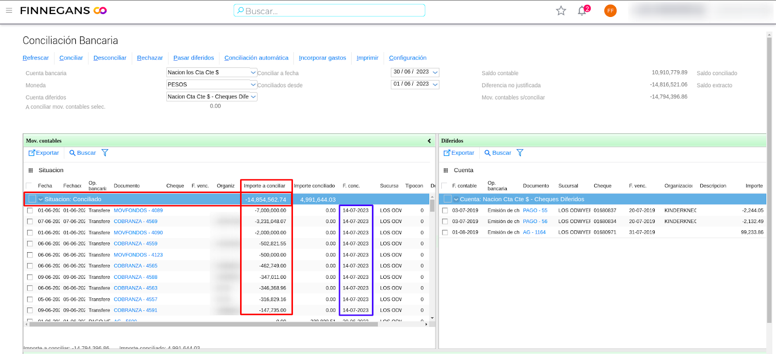 En esta ocasión, se está conciliando a fecha 30/06/2023 y se han conciliado movimientos con fecha 14/07/2023