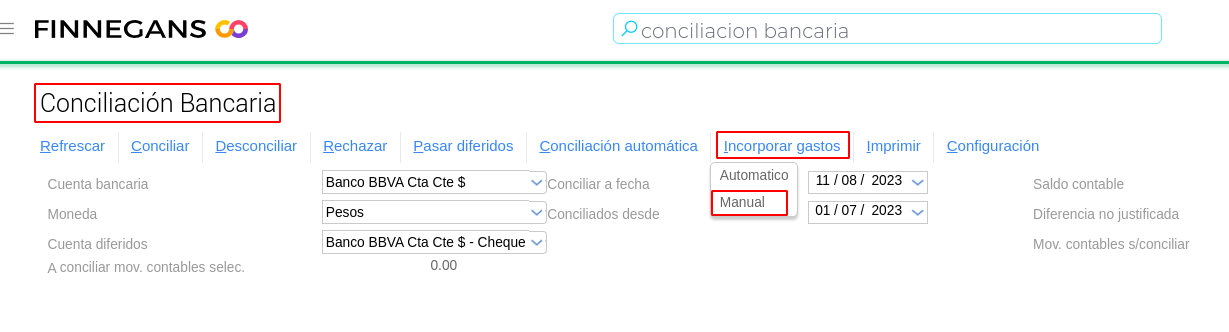 Al momento de intentar “incorporar gastos” de manera manual en la “Conciliación Bancaria” no se genera ninguna acción.