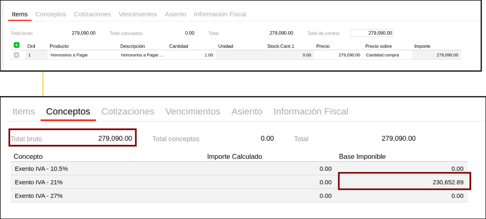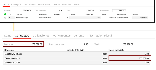 Por ejemplo, en este caso, en la solapa de Items el total de los comprobantes es 279.090 y en la solapa de “Conceptos”, columna de Base imponible, el sistema completa el importe en neto (230.652,89) en el concepto que corresponda la alícuota cargada para el maestro de productos.