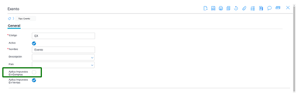 En el maestro de Categoría Fiscal, para la categoría exento, no tiene que tener él tilde en el campo de “Aplica impuestos en compras”.