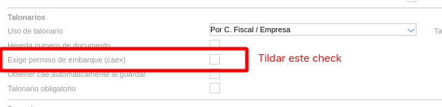 El tipo de documento Factura de Venta de Exportación tiene que tener tildado el check “Exige Permiso de Embarque”.