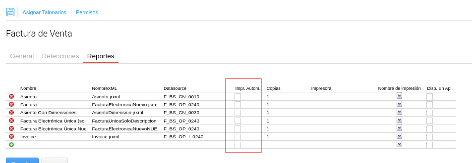 - Tildar el check “Impre. Automatic.” para permitir la generación de la vista preliminar en PDF al guardar la transacción.