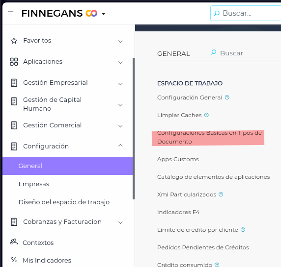 - Dirígete al menú Configuración > General > Espacio de trabajo > Configuracion basica de Tipos de documento.